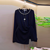 側開叉壓褶小衫 大碼 女裝 圓領亮鉆邊長袖 氣質赫本風胖妹妹上衣 法式